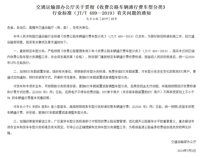中華人民共和國(guó)交通運(yùn)輸行業(yè)標(biāo)準(zhǔn)《收費(fèi)公路車輛通行費(fèi)車型分類》(JT/T 489—2019)已發(fā)布,落實(shí)本行政區(qū)域內(nèi)收費(fèi)公路車型分類調(diào)整工作,并會(huì)同發(fā)展改革(價(jià)格)、財(cái)政部門重新核定車輛通行費(fèi)收費(fèi)標(biāo)準(zhǔn),報(bào)省級(jí)人民政府批準(zhǔn)后,統(tǒng)一從2020 年1月1日起執(zhí)行。