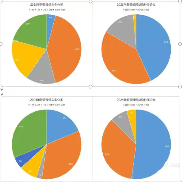 3.自集團“綠色通道”車輛專項治理工作要求以來,鄭庵收費站精細化梳理排查假冒綠通類別,針對性強化查驗。假冒綠通車型和貨物種類分類如圖: